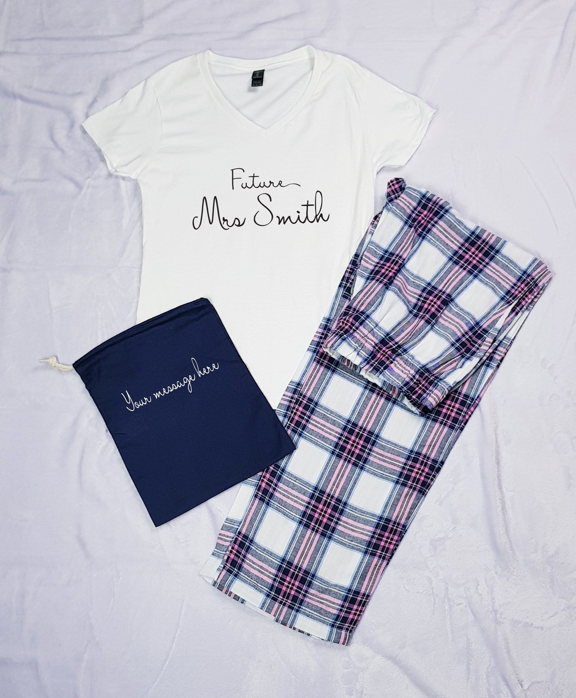 A lovely tartan personalised pyjamas set that comes as a set with a white tshirt, Long pink, white and Navy Blue Tartan trousers as well as a navy blue pouch. This is a perfect gift to give to a new bride or as a bridal shower gift.