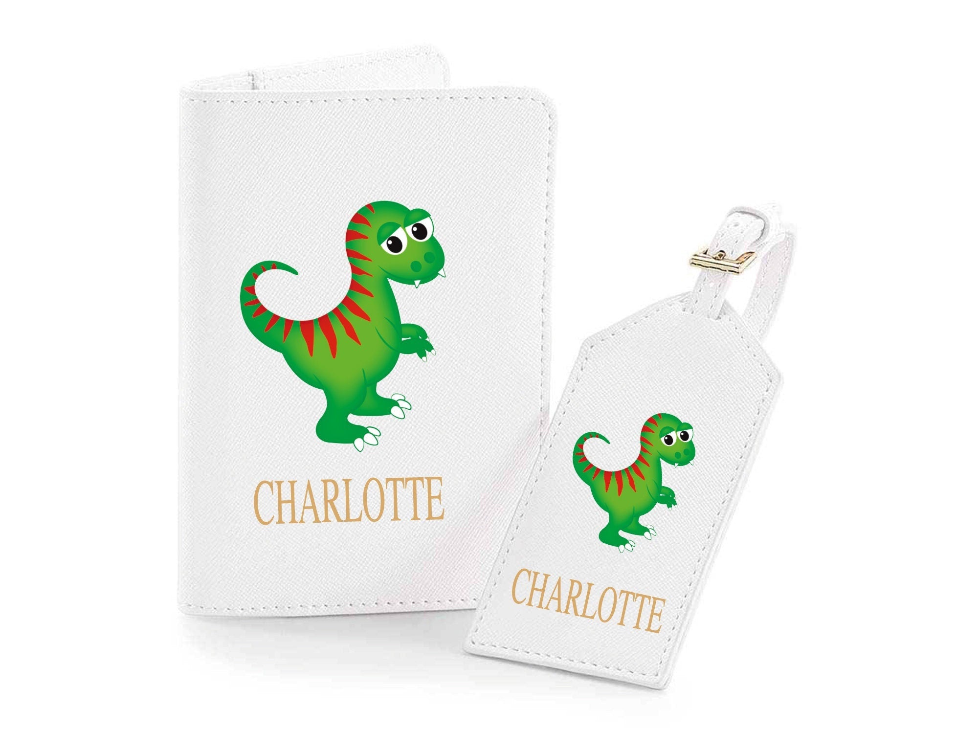 This set is a perfect gift for a newborn baby or a Child as it features a cute Dinosaur design as well as a name of your choice. It is also a perfect accessory for any seasoned traveller to ensure you stay organised with your travel documents and for ease of luggage identification.